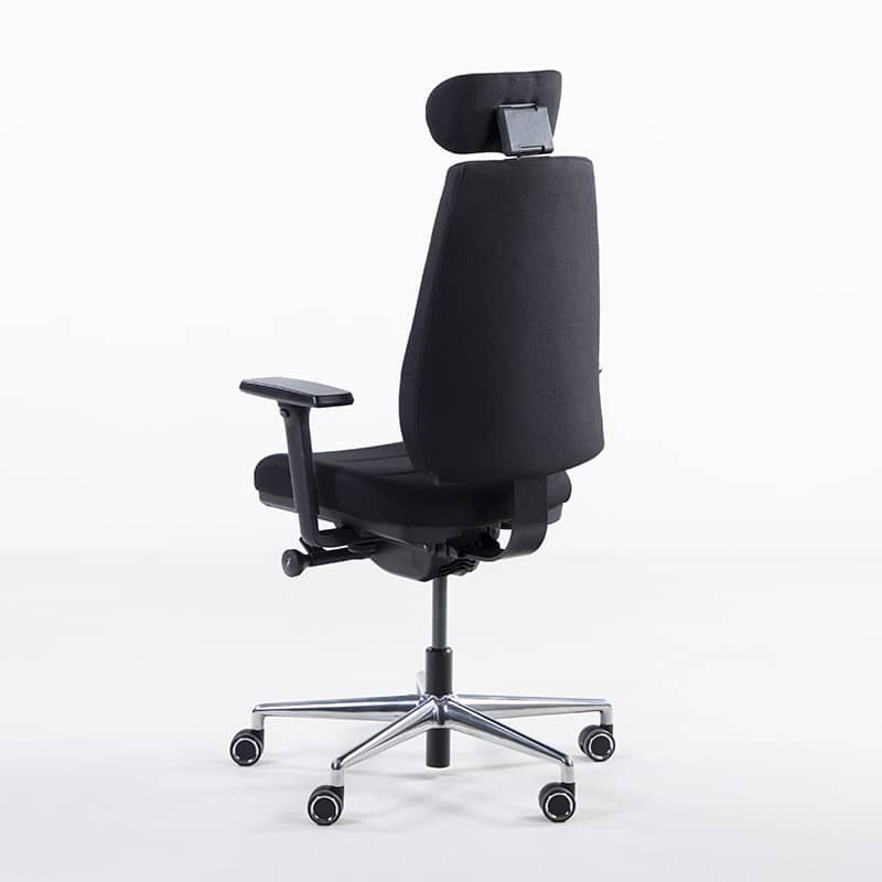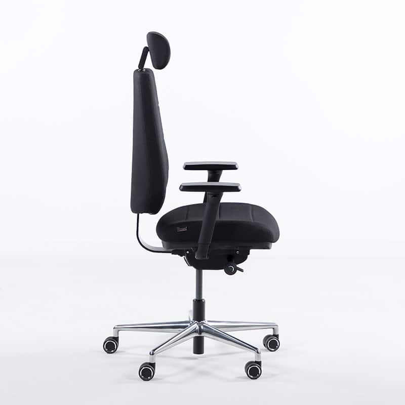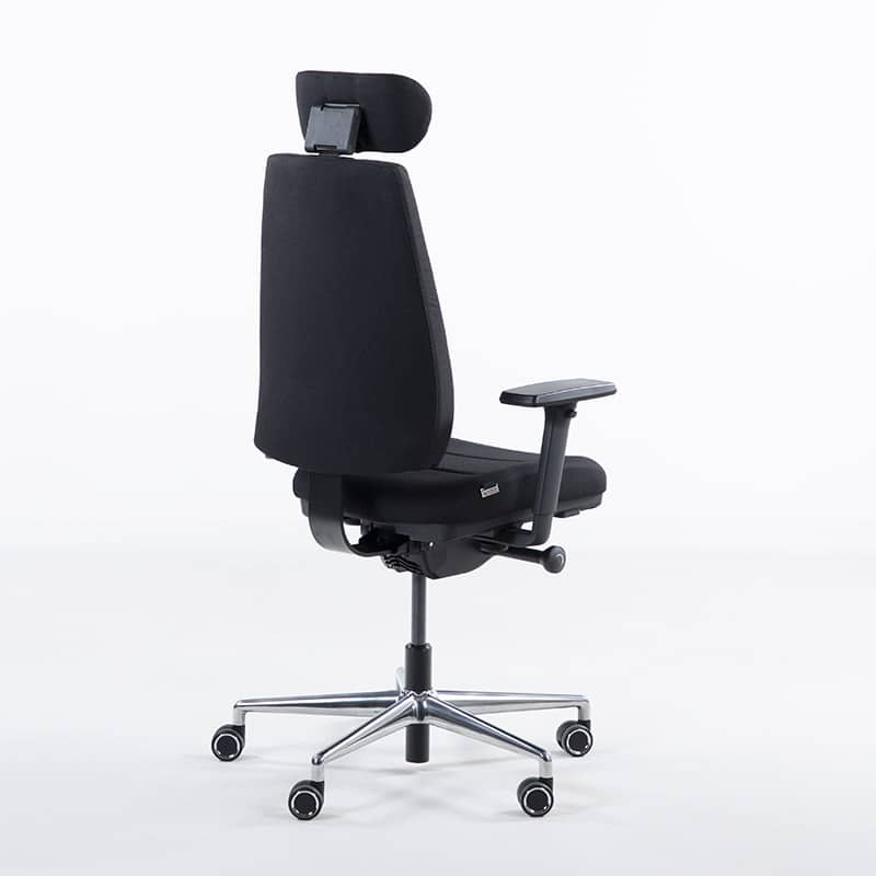 Kontorstol med alt av innstillinger – setet kan justeres fram og tilbake, høyden på ryggen, 3D armlener og justerbar hodehviler.