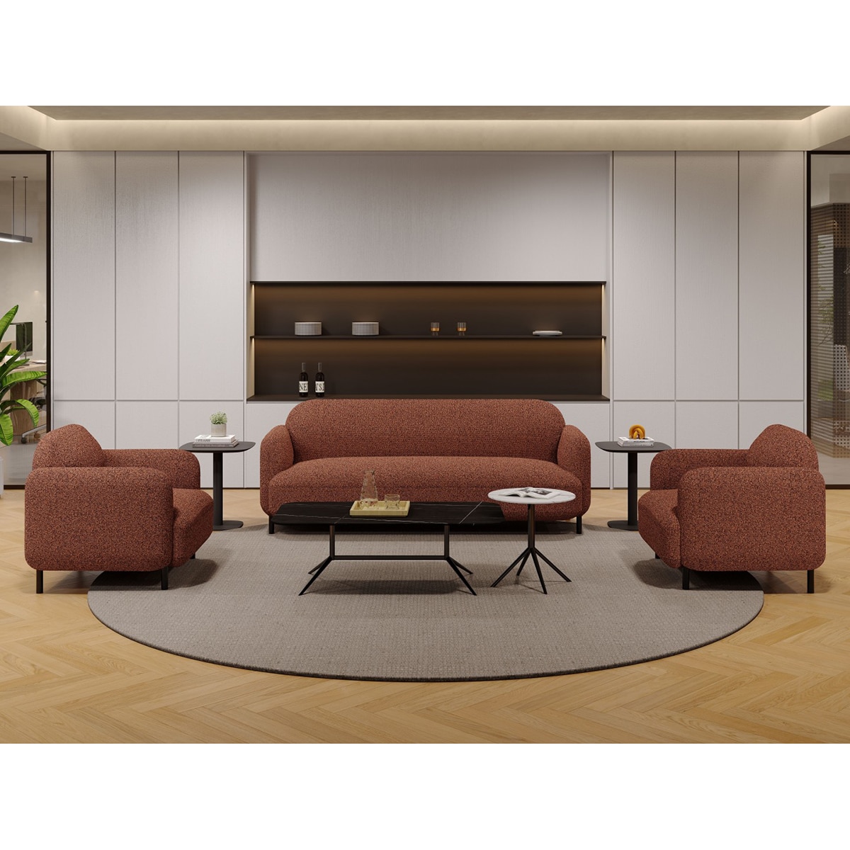 3 seter sofa i slitesterkt, rustrødt stoff. I samme serie finnes stol og puff.